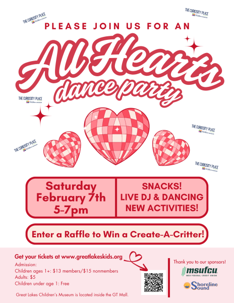 Countdown to Noon is back—and now at our new Curiosity Place location in the Grand Traverse Mall! Join us on December 31 from 10:00am–12:30pm for a family-friendly New Year’s celebration complete with gallery play, festive crafts, and our very own “ball drop” at 12pm sharp. Children over 12 months are $13 for members and $15 for nonmembers. Admission includes regular museum play, GLCM Countdown Party and New Year’s crafts. Adult admission is just $3 for members and $5 for nonmembers, and children under 1 attend free. All proceeds support making Curiosity Place the best place to play in 2026.